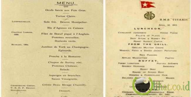 [lihat.co.id] - Titanic tercatat kapal besar sepanjang sejarah mengalami kecelakaan di kutub utara. Kapal itu menabrak gunung es dan karam Namun banyak benda-benda berhasil diselamatkan. Salah satunya daftar menu ini dan berhasil terjual di sebuah rumah lelang di Amerika Serikat seharga Rp 1,5 miliar