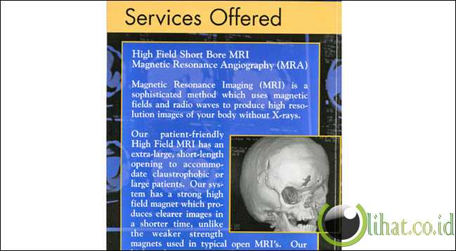 [lihat.co.id] - Foto diatas adalah scan dari sebuah brosur tiga lipatan. Brosur ini diterbitkan oleh "The Diagnostic Imaging Centers of Halifax Medical Center" yang merupakan bagian dari Rumah Sakit Halifax di Daytona Beach, Ormond Beach dan Port Orange, Florida. Ketika publik realtion rumah sakit ini ditanya mengenai foto ini, mereka menjelaskan bahwa ini adalah foto tengkorak anak yang abnormal.